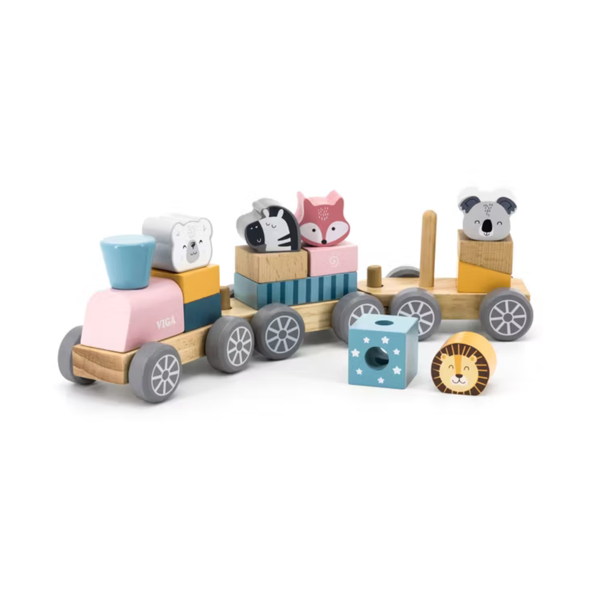 Detta fina klosståg i trä från Viga består av ett stabilt lok och två vagnar som enkelt kopplas ihop. Med färgglada klossar i olika former och djurmotiv kan barnet bygga, stapla och dra tåget över golvet – perfekt för lek som utvecklar både fantasi och motorik.