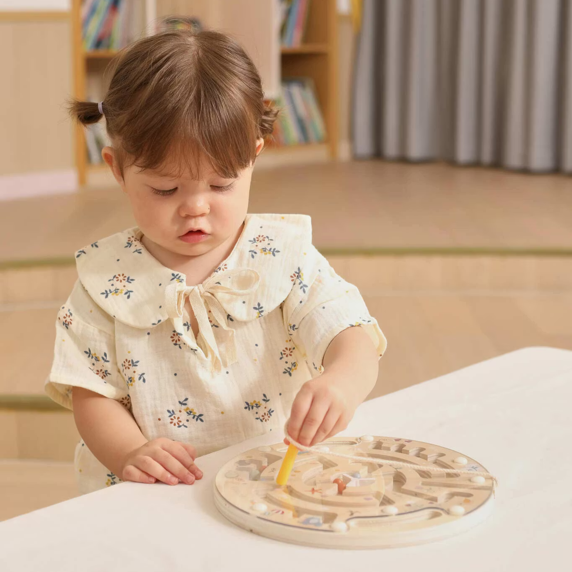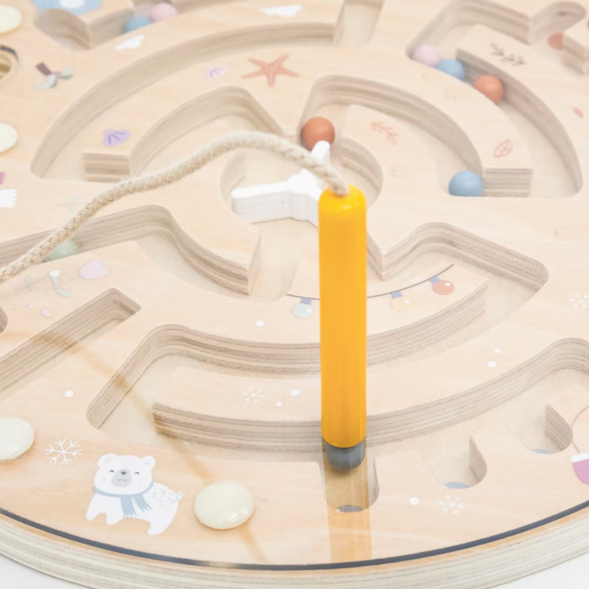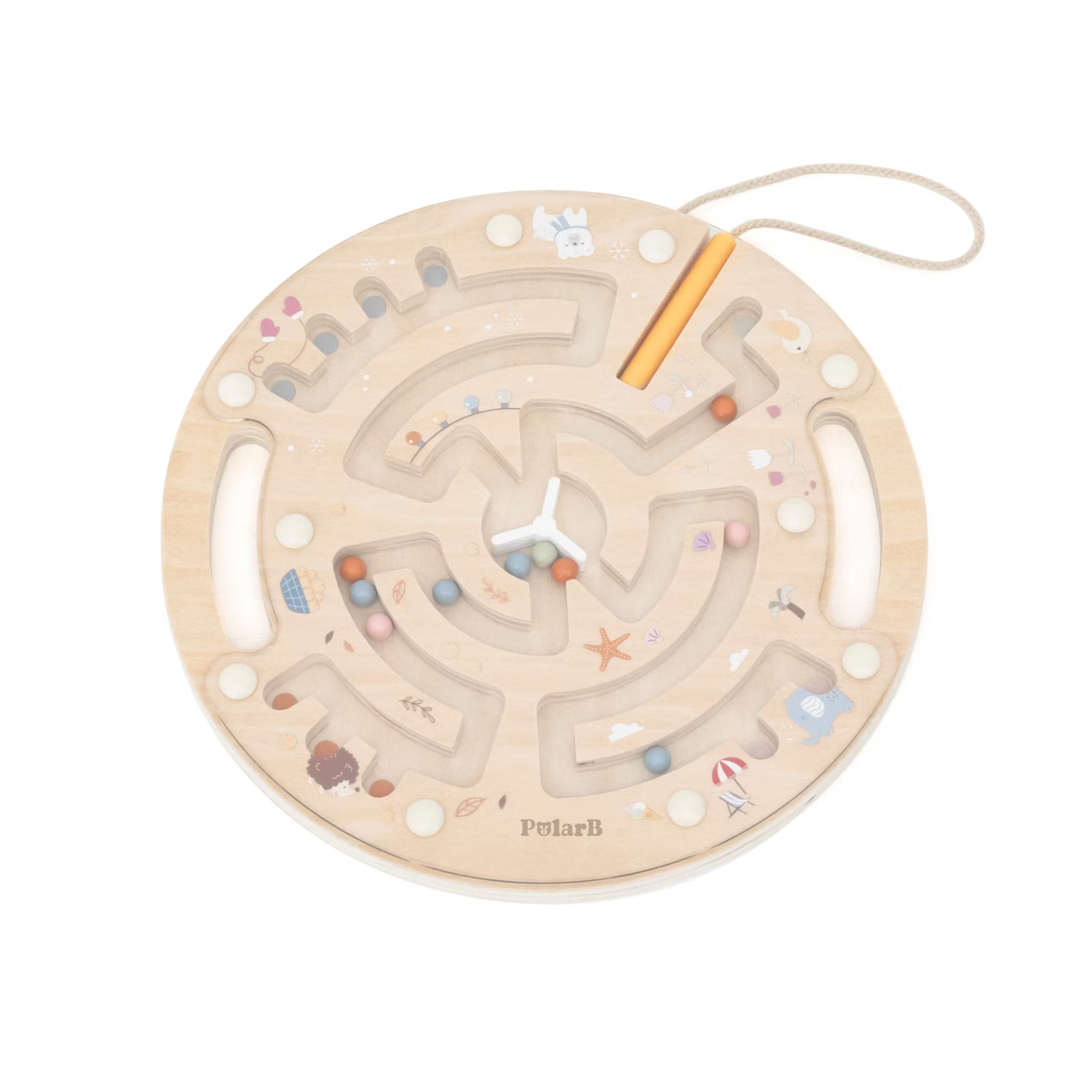 Denna magnetiska labyrint i trä från PolarB by VIGA är en rolig motorikleksak där barnet får manövrera färgade kulor genom olika banor. Med hjälp av handtagen eller den medföljande magnetpennan kan barnet föra kulorna till rätt plats utifrån färg och årstid. En engagerande aktivitet som tränar hand–öga–koordination, finmotorik och färgmatchning.